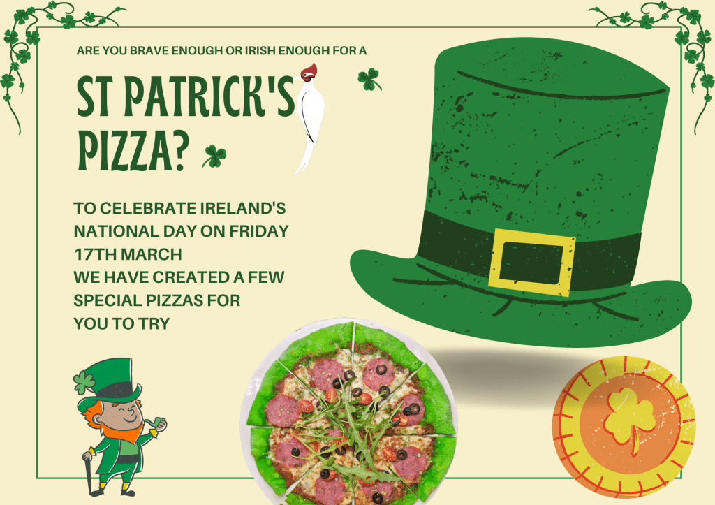 My initial idea for a St Patrick’s Day promotion (a week after my party) was to offer a fee glass of Guinness with every ‘green’ pizza sold. The only problem was that, try as we may we could find no trace of the iconic Irish drink in any bar, wine shop, supermarket, online or anywhere which struck me as being very strange given that Guinness is such a very well known international beer brand. Definitely an opportunity lost, I thought.